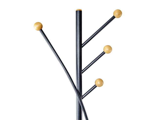 * De jonge, moderne staande kapstok van staal. * Spannend contrast: matzwarte afwerking en ronde beukenhouten knoppen. * Dynamisch design: drie rechte plus een elliptische kapstokhaak. * Ruimtebesparend: geringe diameter, ook voor kleine ruimtes. * Veilig: afgeronde houten knoppen beschadigen de kleding niet. * Bijzonder geschikt voor privé gebruik of als tweede kapstok. * Zuil onderkant Ø 5 cm, bovenkant 2,5 cm. * Metalen haken met doppen, Ø 3,3 cm van hout, vastgelijmd. * Kroonbreedte bovenkant 35 cm. * Stalen voet Ø 36,5 cm, de gebogen vorm zorgt voor een stabiele stand. * Snelle en eenvoudige montage. * Totale hoogte: 180 cm.