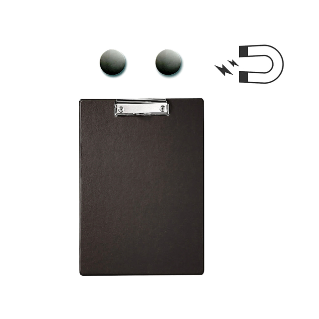 * A4 klembord, stevig karton overtrokken met PP folie. * Formaat A4. * Staand voorzien van een verchroomde papierklem aan de korte zijde van het bord. * Capaciteit 8 mm. * Door de 2 sterke neodymium magneten op de achterzijde is het klembord te bevestigen op elke metalen ondergrond. * Bijvoorbeeld voor het plaatsen van onderhoudsschema's op machines of op magazijnstellingen voor een gemakkelijke inventarisatie. * Het praktische ophangoog biedt u nog meer bevestigingsmogelijkheden. * 2 jaar garantie.