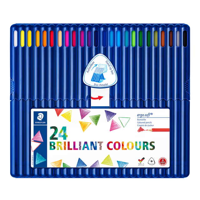 * Standaard kleurpotlood voor alle leeftijden. * Uniek, zacht oppervlak met anti-slip. * Perfecte ergonomie dankzij de driekantige vorm. * Staedtler box, opstelbaar. * Briljante kleuren. * ABS (anti breek systeem). * De witte coating rondom de stift maakt deze 30% breukvaster. * Vervaardigd van hout uit verantwoord beheerde bossen en hiervoor FSC-gecertificeerd. 1 etui x 24 stuk