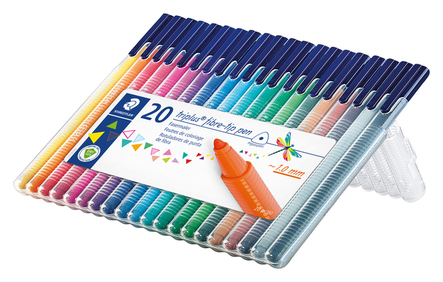 * Triplus color 323 driekantige viltstift. * Ergonomische, driekantige viltstift om ontspannen en zacht te schrijven en te kleuren. * Stabiele, drukbestendige punt. * Geventileerde dop. * DRY SAFE - kan dagenlang open liggen zonder uitdrogen (test ISO 554). * Inkt op waterbasis. * Uitwasbaar uit de meeste textielsoorten. * Lijnbreedte ca. 1,0 mm. * Opstelbare box bevat 20 geassorteerde kleuren.