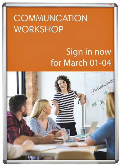 * Wandgemonteerde poster frame met clicklijst. * Weergave formaat: A0 . * Voorzien van een reflectiewerende, polypropyleen afdekplaat ter bescherming van de inhoud. * Handige aluminium clicklijst voor het eenvoudig wisselen van de inhoud. * Gladde afgeronde hoeken voor extra veiligheid. * Veilig door hoekbevestiging. * Maak je eigen gratis te downloaden borden door een bezoek aan de Nobo Sign Maker website met meer dan 100 sjablonen. * Inclusief bevestigingsmateriaal. 1 stuk
