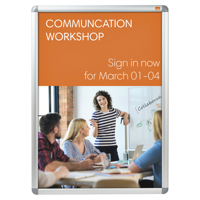 * Wandgemonteerde poster frame met clicklijst. * Weergave formaat: A1. * Voorzien van een reflectiewerende, polypropyleen afdekplaat ter bescherming van de inhoud. * Handige aluminium clicklijst voor het eenvoudig wisselen van inhoud. * Gladde afgeronde hoeken voor extra veiligheid. * Veilig door hoekbevestiging. * Maak je eigen gratis te downloaden borden door een bezoek aan de Nobo Sign Maker website met meer dan 100 sjablonen. * Inclusief bevestigingsmateriaal. 1 stuk