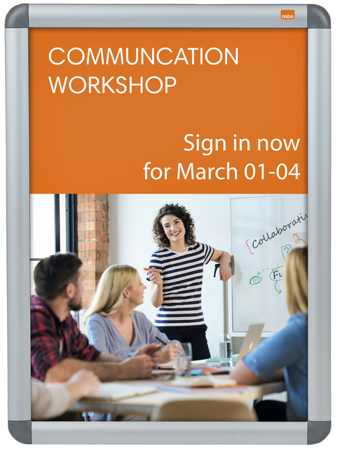 * Wandgemonteerde poster frame met clicklijst. * Weergave formaat: A3. * Voorzien van reflectiewerende, polypropyleen afdekplaat ter bescherming van de inhoud. * Handige aluminium clicklijst voor het eenvoudig wisselen van inhoud. * Gladde afgeronde hoeken voor extra veiligheid. * Veilig door hoekbevestiging. * Maak je eigen gratis te downloaden borden door een bezoek aan de Nobo Sign Maker website met meer dan 100 sjablonen. * Inclusief bevestigingsmateriaal. 1 stuk