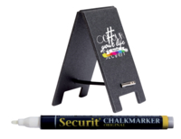 * Securit mini tafelstandaard set. * Deze mini tafelstandaard kan aan beide zijden beschreven worden. * Door middel van meegeleverde elastieken kan deze mini tafelstandaard overal neergezet worden. * Voor het beste schrijfresultaat gebruikt u de Securit krijtstiften. * Krijtbord is eenvoudig te reinigen met een vochtige doek. * Deze set bestaat uit: 5 mini tafelstandaards, 5 elastieken en één witte krijtstift (schrijfbreedte 1-2mm).