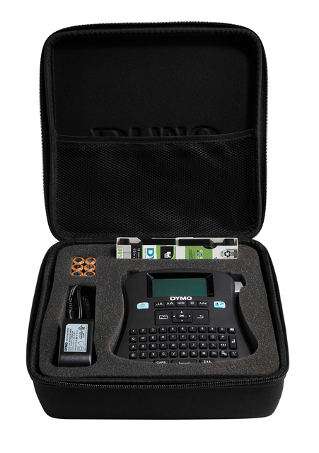* Bureaumodel met Qwerty toetsenbord. * Print professionele kwaliteitslabels op 6, 9 of 12mm D1 tape. * Groot grafisch display met afdrukvoorbeeld. * Gebruiksvriendelijke functie- en navigatietoetsen. * Snelle toegangsknoppen voor interpunctie en valutasymbolen. * Diakritische tekens (bijvoorbeeld é, à, ç, …) zijn met een speciale knop in te voeren. * Drukt 1 of 2 regels per label af D1 tape van 6, 9 of 12mm. * Slaat tot 10 labels op met optie om opgeslagen tekst in te voegen. * Automatische uitschakelfunctie na 2 minuten. * Horizontaal of verticaal afdrukken. * Links, rechts of centraal uitlijnen. * 6 lettergroottes, 7 stijlen en 8 kaderstijlen. * Labels met vaste of variabele lengte maken. * Tot 10 labelkopieën afdrukken. * Werkt op 6xAA batterijen of AC stroomadapter (bij dit pakket reeds meegeleverd). * Afmetingen 165x155x64mm.* In deze speciale Kit zitten naast de machine één tape van 12mm zwart op wit, een AC-adapter en een naslaggids. * Totaal geleverd in een handige draagkoffer.
