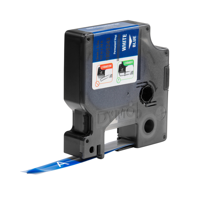 * Dymo Rhino vinyl labeltape. * Labels van vinyl zijn de perfecte oplossing als u wilt dat uw identificatie duidelijk wordt begrepen. * Te gebruiken voor o.a. schakelpanelen, stopcontacten, knoppen, etc. * Vinyllabels zijn bestand tegen vochtigheid, uv-stralen en chemicaliën waardoor ze uiterst geschikt zijn voor labeltaken zowel binnens- als buitenshuis. * Beschikbaar in een uitgebreid assortiment die voldoen aan de OSHA,ANSI- en ISO-normen. * UL-erkend als onderdeel van de UL 969-normen is RoHS conform. * De Rhino tapes zijn niet geschikt voor tape printers van andere merken en ook niet geschikt voor LetraTag printers. * Met een 12mm brede tape kunt u labels maken die goed leesbaar zijn. * Hou rekening met de marges die langs de randen van de tape nodig zijn voor de printer, de tekstgrootte zal maximaal 9mm zijn. * De bandlengte is 5,5m. * De kleur van de tape is blauw, de opdruk wit. 1 stuk