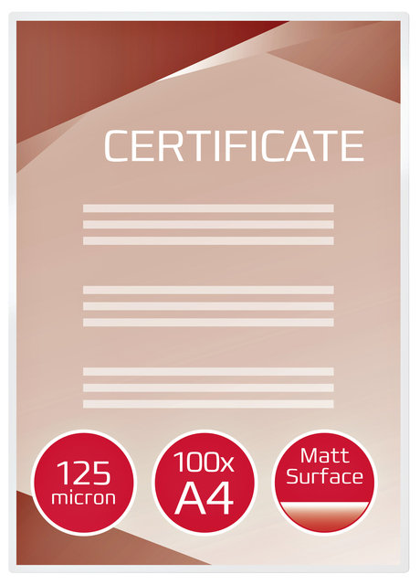 Beschermt documenten die intensief worden gebruikt door middel van een stevige, matte lamineerlaag die aan beide zijden van het papier hecht, nauwelijks licht reflecteert en beschrijfbaar is. * Producteigenschappen; * 2x125micron. * A4-formaat. * Aantal stuks per verpakking: 100. * Afmetingen: 216 x 303 mm (oversize A4). * De ideale hoes voor normaal A4-papier, met voldoende ruimte voor foutcorrectie en voor het eenvoudig uitlijnen van het papier.* Compleet waterbestendig. * Niet-reflecterende matte afwerking. * Voelt zijdeachtig aan. * Beschrijfbaar oppervlak. * Beperkt uitlijningsproblemen tot een minimum. * Lange levensduur: gelamineerde artikelen zouden minimaal een jaar mee moeten gaan, afhankelijk van de omstandigheden en de lamineerdikte. * Aan te passen op het formaat en de vorm van het papier: lamineerhoes kan eenvoudig op maat worden gesneden. 1 pak x 100 stuk