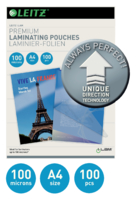 * Ultra Premium hoezen voor warmlamineren. * Hoogglans. * Leitz iLAM lamineerhoezen voldoen aan de hoogste vereisten voor bescherming van belangrijke documenten en presentaties. * Geen zorgen meer! De Unique Direction Technoloy verzekert een perfect resultaat. * Lamineren is zeer eenvoudig met Unique Direction Technology - plaats het document in de hoes en voer het in de lamineermachine in - pijltjes op de hoes tonen de juiste invoerrichting en verdwijnen na het lamineren. 1 pak x 100 stuk