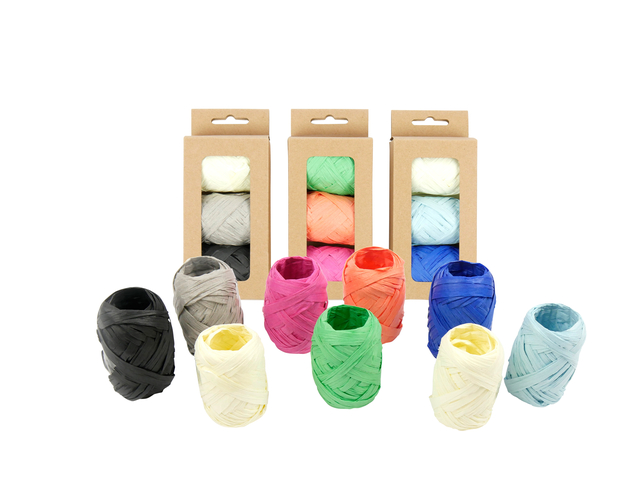 * Lint van raffia assorti in 3 kleuren: oranje, groen en roze.
