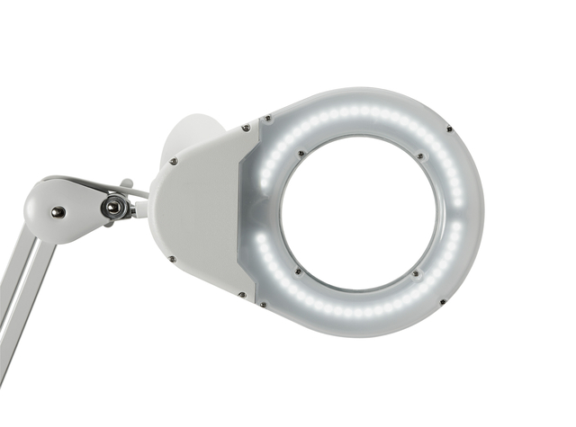 * Stabiel en solide, met veel verstelmogelijkheden.* Met moderne LED-techniek en elegant lampenkapdesign.* Gegarandeerd geen stroomverbruik in uitgeschakelde toestand.* Sterke dubbele parallellogram metalen arm.* Gelijkmatige lichtverdeling zonder schaduw door ringvormig aangebrachte LED's.* Technisch veiligheidsconcept Made by MAUL. * Perfect voor precisiewerk in laboratoria, fijnmechanica, werkplaatsen, machinekamers, technische bureaus, artsenpraktijken of privé voor handenarbeid, postzegelverzamelaars of modelbouw.* Dubbele functie: loep en doelmatige werkplekverlichting.* Inclusief lens beschermdeksel, waardoor stof en directe inval van zonlicht wordt vermeden.* 3 dioptrieën glazen lens (1,75-voudige vergroting), Ø 5" (12,7 cm), lensoppervlakte 144 cm2.* Robuuste metaalarm. * Lichtsterkte lamp: 2120 lux op 35 cm afstand.* Kleurtemperatur per lichtbron: 6500 Kelvin (daglicht wit).* Aantal lichtbronnen: 1.* Energie-efficiëntieklasse per lichtbron: E (spectrum A tot G).* Gewogen energieverbruik per lichtbron: 8 kWh/1000 h.* Levensduur per lichtbron (L70B50): 50000 h.* Nuttige lichtstroom per lichtbron: 935 Lumen.* Materiaal: Kop: kunststof - Arm: metaal.* Afmetingen: Kop: 26,5x20 cm.* Mobiliteit: Kop: kantelbaar, draaibaar.* Schakelaarpositie: Kop. * Milieuvriendelijke en veilige verpakking, recyclebaar.* Technisch veiligheidsconcept Made by MAUL: alleen lampen en verlichtingsarmaturen die intensieve tests hebben ondergaan en zijn goedgekeurd, worden opgenomen in ons programma. Een team met kennis van optica, elektronica, mechanica en ook productietechniek staat garant voor de veiligheid van de loeplamp LED MAULviso. * 826 34: Armlengte beneden en boven 41 cm. Hoogte in normale werksituatie 41 cm, hoogte instelbaar tot 75 cm. Arm kan 360° gedraaid worden. Tafelklem van met kunststof overtrokken metaal, tot 6,3 cm. 1 stuk