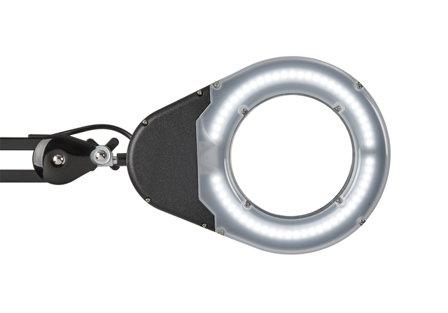* Stabiel en solide, met veel verstelmogelijkheden met moderne LED-techniek en elegant lampenkapdesign * Gegarandeerd geen stroomverbruik in uitgeschakelde toestand * Sterke dubbele parallellogram metalen arm * Gelijkmatige lichtverdeling zonder schaduw door ringvormig aangebrachte LED's * Perfect voor precisiewerk in laboratoria, fijnmechanica, werkplaatsen, machinekamers, technische bureaus, artsenpraktijken of privé voor handenarbeid, postzegelverzamelaars of modelbouw * Technisch veiligheidsconcept Made by MAUL * Dubbele functie: loep en doelmatige werkplekverlichting * Inclusief lens beschermdeksel, waardoor stof en directe inval van zonlicht wordt vermeden * 3 dioptrieën glazen lens (1,75-voudige vergroting), Ø 5" (12,7 cm), lensoppervlakte 144 cm² * Diffusor zorgt voor minder schaduwwerking * De kap is driedimensionaal verstelbaar * Vervanging van lichtbron en voorschakelapparatuur door een gekwalificeerde elektricien. * Lichtsterkte lamp:2.120 lux op 35 cm afstand * Kleurtemperatur (per lichtbron)6.500 Kelvin (daglicht wit) * Aantal lichtbronnen:1 * Energie-efficiëntieklasse (per lichtbron) E (spectrum A tot G) * Gewogen energieverbruik (per lichtbron)8 kWh/1000 h * Levensduur L70B50 (per lichtbron)50.000 h * Nuttige lichtstroom (per lichtbron)935 Lumen * Materiaal:Kop: kunststof - Arm: metaal * Afmetingen:Kop: 26,5 x 20 cm * Mobiliteit:Kop: draaibaar, kantelbaar * Schakelaarpositie:Kop * Tafelklem van met kunststof overtrokken metaal, tot 6,3 cm. Hoogte: 49,5 cm. * Armlengte beneden en boven 41 cm. * Arm: kantelbaar, draaibaar