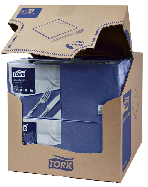 *Met de Tork papieren servetten donkerblauw voldoe je aan jouw kwaliteitseisen en blijf je toch binnen het budget.* Deze 2-laags papieren servetten in lunchformaat zijn ideaal voor eetgelegenheden die broodjes, kleine gerechten en snacks serveren. * Het papier van de servetten zijn stevig en absorberend, waardoor het opvegen van drankjes van gemorste drankjes of eten eenvoudig wordt. * Afmeting 80x328x162mm..