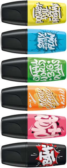 * De STABILO Boss mini by Snooze One is de nieuwe edition van de bekende Boss mini markeerstiften. * Maak van iedere tekst een echte eye-catcher. * De bekende kwaliteit van de grote STABILO Boss in een handig mini formaat. * Onderstrepen én markeren dankzij de beitelpunt met twee schrijfbreedtes: 2 en 5 mm. * Maak je geen zorgen als je de dop er even af laat, de markeerstiften kunnen tot 4 uur zonder dop zonder uit te drogen, dankzij de anti-uitdroog technologie. * Inkt op waterbasis. * Het mini formaat is perfect voor onderweg en past in elke etui. * De 5 neon kleuren én de zwarte marker maken het markeren en onderstrepen van teksten extra leuk. * Ze zijn er in 6 kleuren met verschillende opdruk; geel “Pocket full of dreams”, blauw “Stay in the flow”, groen “Small world big plans”, oranje “Stay true”, roze “RISE”, zwart “BAM!”. * Aantrekkelijk design in 6 kleuren: geel, groen, oranje, roze, blauw én zwart voor onderstreping of omlijning.