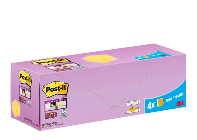 * Post-it® Super Sticky Notes. * Hechten steviger en gaan langer mee, met tweemaal zoveel kleefkracht als de originele Post-it® Notes.* De handigste manier om snel een notitie te maken, een berichtje te sturen of een geheugensteuntje achter te laten. * Post-it® Super Sticky Notes zijn gemaakt van papiervezels met PEFC-certificering, afkomstig uit duurzaam beheerde bossen en gecontroleerde bronnen. * Afmeting: 76mm x 76mm. * Voordeelpak 24 stuks (20+4 gratis). * 90 Vellen per blok. * Kleur: geel.