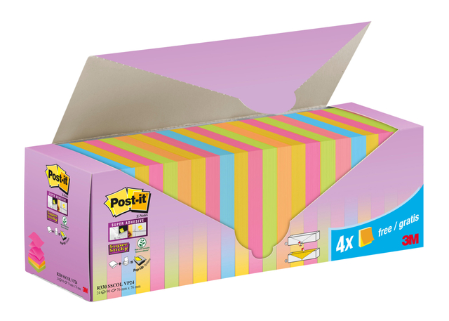 * Post-it® Super Sticky Z-Notes hebben tweemaal zoveel kleefkracht (vergeleken met de originele Post-it® Notes). * Deze zelfklevende Z-Notes zijn perfect als je aan het bellen bent of niet beide handen vrij hebt: trek een blaadje los en houd één hand vrij. * Ze zijn bijzonder sterk, uiterst veelzijdig en ontworpen om je bericht te laten opvallen. * 76mmx76mm. * Diverse Kleuren. * 90 vel per blok. * Voordeelpak van 20 + 4 Gratis. * PEFC gecertificeerd.