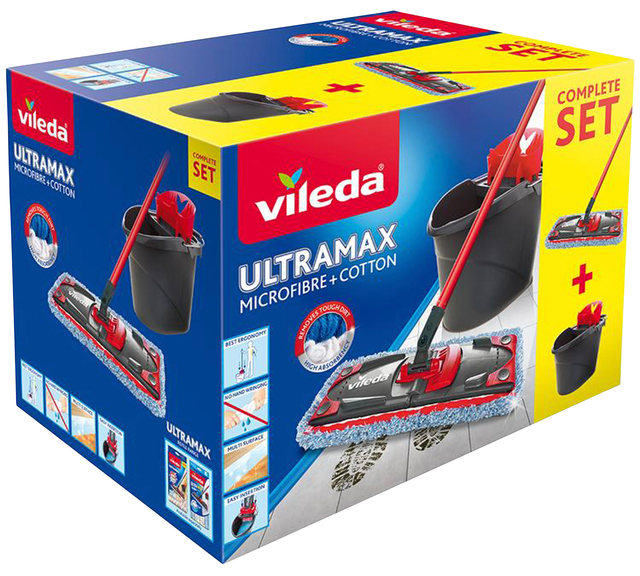 * De complete kit UltraMax Microfibre & Cotton van Vileda is ideaal om tegelvloeren grondig en tot in de voegen schoon te maken. * Met de UltraMax bezemmop kunt u efficiënt en zonder vermoeidheid vlekken verwijderen. * Je handen blijven schoon en droog dankzij de geïntegreerde pers op de emmer. * Deze versie wordt geleverd met een Micro- en Katoenen hoes. * Deze hoes is ideaal voor het dieptereinigen van tegels, kunststof vloeren, stenen of terracotta vloeren. * Drievoudige reiniging dankzij de 3 materialen: microvezels om te ontvetten, katoen om te absorberen, en vezellusjes om de tegelvloeren perfect te reinigen. * De totale stellengte is 130cm. * De wisbreedte van de mop is 28cm.