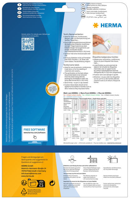 * Textieletiketten van acetaatzijde, op A4-vellen zelfklevend, verwijderbaar, etiketformaat 80x50mm wit, 25 vel per verpakking. Ideaal geschikt voor seminars, vergaderingen, beurzen of voor het labelen van stoffen, tapijten en matrassen. Praktisch alternatief voor plastic plaatjes: snel beschreven, perfect hechtend zonder speldje. Flexibel textielmateriaal, goed hechtend, goed verwijderbaar. Attentie: niet op fijn leer of fijne textiel, bijv. zijde of fluweel plakken. Voor laserprinters, kopieerapparaten, kleurenlaserprinters en kleurenkopieerapparaten. Niet geschikt voor inkjetprinters. Gratis softwareoplossingen: www.herma.com/software.
