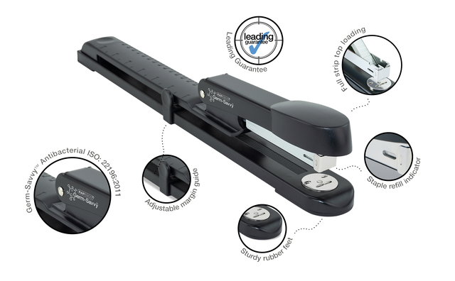 * Vervaardigd met een sterke metalen bovenarm en bovenlader nietkop. * De zacht aanvoelende bovenkap zorgt voor extra comfort en Germ-Savvy® levenslange antibacteriële bescherming, waardoor dit product zeer geschikt is voor gebruik in gedeelde omgevingen. * Gekalibreerde, verstelbare papiergeleider/marge-insteller, met een nietdiepte tot 300mm en een velcapaciteit van 25 vel (80 g/m²). * Gebruikt nietjes 26/6 & 24/6 mm en wordt geleverd met 105x nietjes 26/6 mm voor een snelle start.
