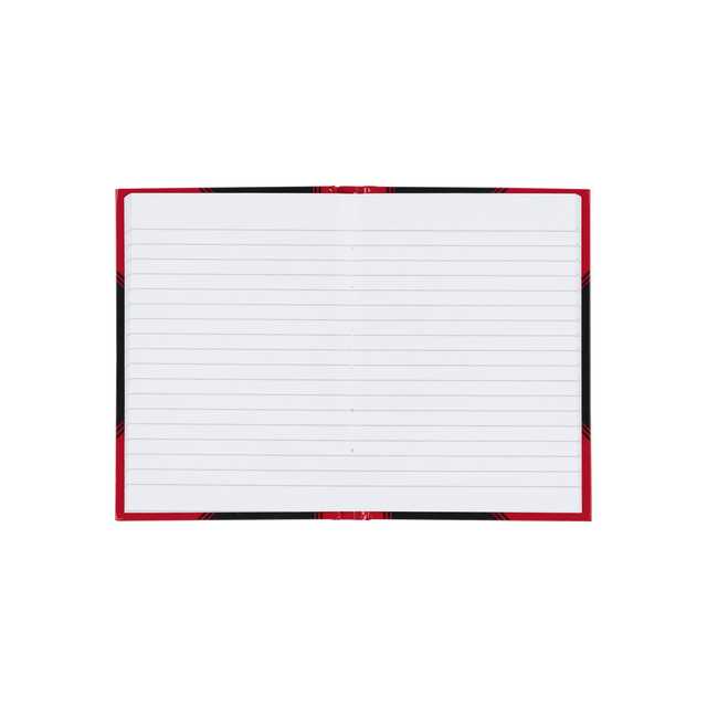 * A6 gebonden notitieboek met een harde kaft en 96vel gelinieerd papier. * 70gr houtvrij papier. * Gelijnd zonder kantlijn. * De stevige duurzame omslag en het mooie design zorgen voor een optimale schrijfervaring. * In de bekende zwart-rode uitvoering. * De genaaide binding houdt de notities stevig bij elkaar. 1 stuk