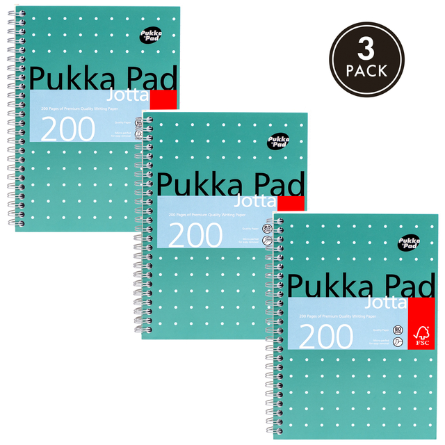 * De mogelijkheden voor onze notitieblokken zijn eindeloos, of het nu voor terug naar school, de universiteit of gewoon een ruimte voor je ideeën is. Onze A4 jotta notitieblokken zijn de perfecte aanvulling op je kantoorartikelencollectie. De Metallic jotta is A5-formaat en bevat 200 pagina's van hoogwaardig 80gr papier met een lijndikte van 8 mm, essentieel voor het maken van notities. Onze iconische Metallic jotta-notitieblokken zijn wereldwijd geliefd om hun professionele ontwerp en papier van hoge kwaliteit. Verkrijgbaar in een verpakking van 3 stuks. Onze stevige, stijlvolle en veelzijdige notitieblokken zijn fantastisch voor het organiseren van werkprojecten, cursuswerk of revisie.