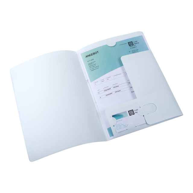 * Kunststof offertemap op A4-formaat. * Met insteektas op de voorzijde voor individuele opmaak. * Insteek voor visitekaartje. * Uitsparingen voor het opbergen in ordners. * Voor het professioneel opbergen van offertes en andere documenten. * Capaciteit 50vel papier. * Met 2 stofkleppen. * Afmetingen 222x315mm. 10 stuk