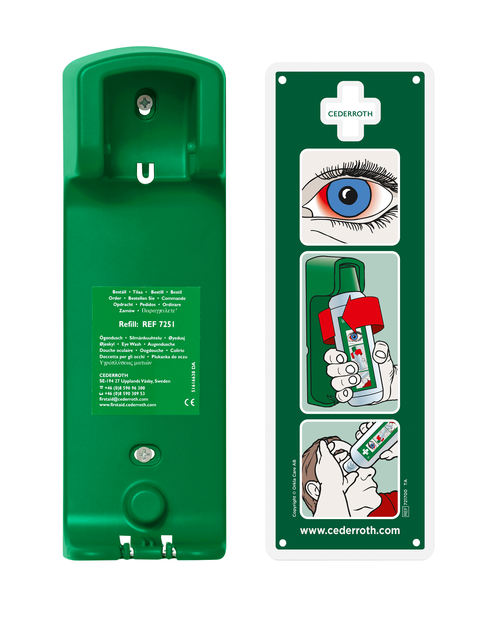 * Bij een ongeluk is het belangrijk binnen de eerste seconden te beginnen met spoelen. * Het is ook belangrijk te zorgen voor een effectieve spoeling, met een rijkelijke vloeistofstroom. * De vloeistof moet ook zijn gebufferd, d.w.z. neutraliserend werken op spatten van alkaliën (bijvoorbeeld loog) en zuren (bijvoorbeeld. accuzuur). * De Wandhouder kan op verscheidene manieren worden geplaatst en past daarom op elke werkplek en in iedere ruimte. 1 stuk