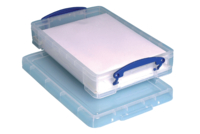 * Really Useful opbergboxen zijn stapelbaar met of zonder deksel. * Ze zijn zo sterk dat het het gewicht van één persoon houdt. * Elk product is bestendig tegen temperaturen van -15°C tot +80°C. * Minimale zijkant aanpassingen om opbergruimte te maximaliseren, dit zorgt tevens ook dat de inhoud minder kan bewegen tijdens transport. * Volledig platte en versterkte bodem. * Het sluitmechanisme houdt de doos en het deksel tezamen. * De doorzichtige doos heeft het voordeel dat u steeds de inhoud ziet. * De verschillende afmetingen zijn onderling opstapelbaar. * Geschikt voor 500vel A4 papier. * Afmetingen buitenmaat: 395x255x85mm ( dit is incl deksel) binnenmaat: 335x210x70mm. 1 stuk