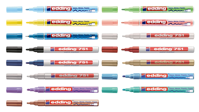 * edding glanslakmarker met lakachtige dekking. * Hecht permanent en dekkend op praktisch alle materialen, ook op donkere en transparante ondergronden en glas. * Zeer geschikt om te decoreren. * Ronde punt. * Reukarm. * Schrijfbreedte 1-2mm.
