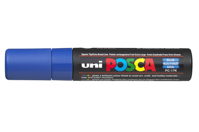 De PC-17K met extra brede punt van 15mm is de expert van het POSCA-gamma. Met zijn XXL-patroon, is hij de bondgenoot van kunstenaars en professionals voor gigantische ontwerpen en uitvoeringen. De PC-17K is geschikt voor kunstenaars om foutloze achtergronden op grote doeken te schilderen, live grote werken uit te voeren; voor liefhebbers van home deco om een tweede leven te geven aan een ruimte, een meubel, een stof of een omvangrijk voorwerp; voor professionals om etalages of displays te versieren. . Toepasbaar op papier, plastic, glas, textiel, hout, steen, porcelein enzovoorts. Perfect om unieke ontwerpen mee te maken, voor zowel binnenshuis als buitenshuis. De pigment-houdende inkt is op water basis en is reukloos in gebruik. * Geschikt voor alle ondergronden. * Hoge UV weerstand. * Dekkende ondoorzichtige kleuren. * Uitwasbaar. * Mengbaar. * Aquerelleerbaar. * Overschilderbaar. * Kleur: donker blauw.
