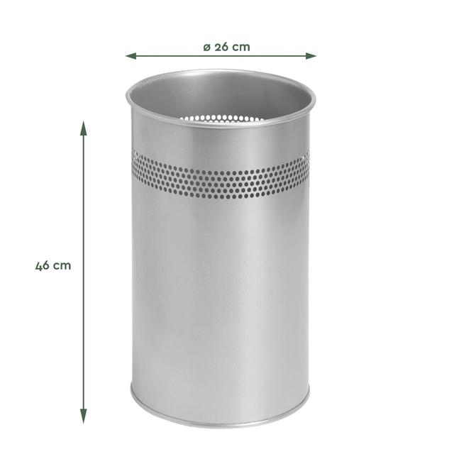 * Dé perfecte oplossing voor al je rondslingerende papier, propjes en afval. De BRASQ Papierbak is een ideale papier- en/of afvalbak. * Zorg een schoon leef- en werkmilieu! Deze praktische en handzame BRASQ Papierbak past in elk interieur. En nog een handige extra functie, deze papierbak kan ook dienst doen als Paraplubak. Met zijn ronde vorm biedt hij een stevige basis om wandelstokken of paraplu’s netjes weg te zetten. * Zet hem onder je bureau en gooi nooit meer mis. De BRASQ Papierbank, of prullenbak, zal niet misstaan op kantoor, studeerkamer, thuiswerkplek, hotelkamer of winkel en neemt door zijn compacte design weinig ruimte in. * Gemaakt van een stevig metaal met aan de bovenzijde een elegante perforatierand. De papierbak heeft een inhoud van 21 liter, een dikte van 0,4mm en weegt slechts 1,25kg, waardoor hij makkelijk verplaatsbaar is. * De prullenmand kan ook als afvalbak gebruikt worden en is voorzien van een sterke epoxy laklaag. De poedercoating is van hoogwaardige kwaliteit. Deze bin heeft een doorsnede van Ø26cm en is 46cm hoog. * Dit product is voor 100% recyclebaar. * Garantie: 1 jaar