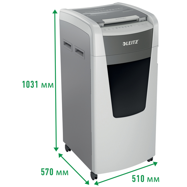 Volautomatische papiervernietiger van Leitz met unieke, “clean emptying” functie. Zo intelligent dat hij zelfstandig werkt, voer je stapel papier in (incl. nietjes & paperclips), sluit het deksel en ga verder met waar je mee bezig was. Ideaal te gebruiken in grote kantoren. Hogere beveiliging en uitstekende prestaties met de anti-vastlooptechnologie, stille en 240 minuten doorlopende werkduur auto feed papiervernietiger. Vernietig automatisch in één keer 600 vellen A4 in P5 micro cut snippers (2x15mm). Met een ruime 110L opvangbak. Eenvoudige bediening door middel van tiptoetspaneel. * Producteigenschappen; * Automatische invoerfunctie voor maximaal 600 A4-vellen. Versnippert tot 10 vellen (80 gsm) tegelijkertijd bij handmatige invoer. * Unieke ”Clean emptying” functie (mesjes keren na gebruik terug) voorkomt dat papiersnippers achterin de bak vallen als je hem eruit haalt, zodat je de bak altijd kunt legen zonder rommel. * ”Bak vol” infraroodsensor en 80%-vol-melding waarschuwen de gebruiker dat de bak geleegd moet worden om rommel te voorkomen.