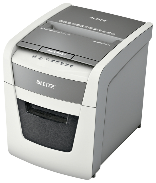 Volautomatische papiervernietiger van Leitz. Zo intelligent dat hij zelfstandig werkt, voer je stapel papier (incl. nietjes & paperclips) in, sluit het deksel en ga verder met waarmee je bezig was. Ideaal voor klein kantoor of kantoor aan huis. Hogere beveiliging en uitstekende prestaties met de anti-vastlooptechnologie, stille en 10 minuten doorlopende werkduur auto feed papiervernietiger. Vernietigt automatisch 50 vellen A4 in P4 cross cut snippers (4x28mm) tegelijkertijd in de ruime 20L opvangbak. Eenvoudige bediening door middel van tiptoetspaneel. * Producteigenschappen; * Automatische invoerfunctie voor maximaal 50 A4-vellen. Versnippert tot 6 vellen (80 gsm) tegelijkertijd bij handmatige invoer. * Infrarood „bak vol” sensor. * Ultrastille werking - voor een rustige werkomgeving (bij regelmatig gebruik van Leitz oliepapier). * Anti-vastlooptechnologie voor ononderbroken papiervernietiging - stopt automatisch en duwt het papier naar buiten als er te veel papier wordt ingevoerd. * Continue doorlooptijd van 10 minuten. * Veiligheidsniveau DIN P4 cross cut (4x28mm). * Compacte uittrekbare bak van 20L zodat alle invoer in één keer kan worden vernietigd. * Tiptoetsbediening - simpel en intuïtief voor eenvoudige bediening
