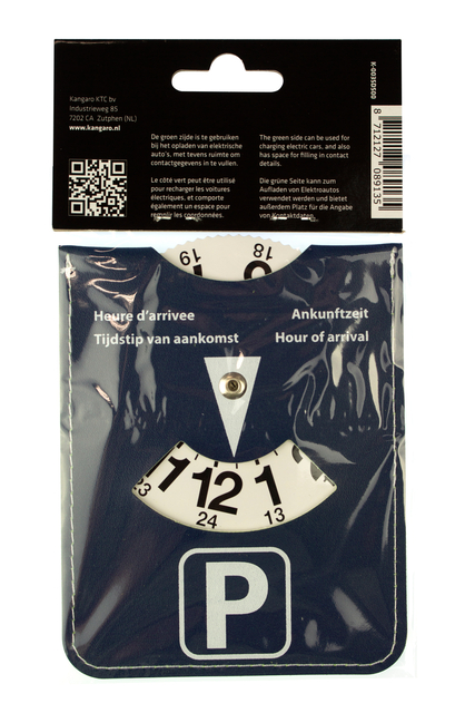 * Parkeerschijf Kangaro E-car met blauwe en groene zijde in kunstlederen houder. * De Kangaro parkeerschijf voldoet aan de regeling zoals opgenomen in het besluit parkeerschijf Wegenverkeerswet. * De groene zijde is te gebruiken bij het opladen van elektrische auto's, met tevens ruimte om contactgegevens in te vullen.