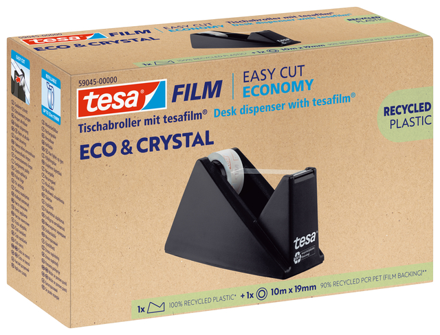 * Bureaudispenser gemaakt van 100% gerecycled plastic (behuizing). * Inclusief 1 rol tesafilm® eco & crystal. * De tape biedt een sterke kleefkracht. * Transparante tape is gemaakt van 90% gerecycled PET-materiaal. * Scheurbestendig. * Hoogwaardige tesa® tape volgens een innovatief productieproces.