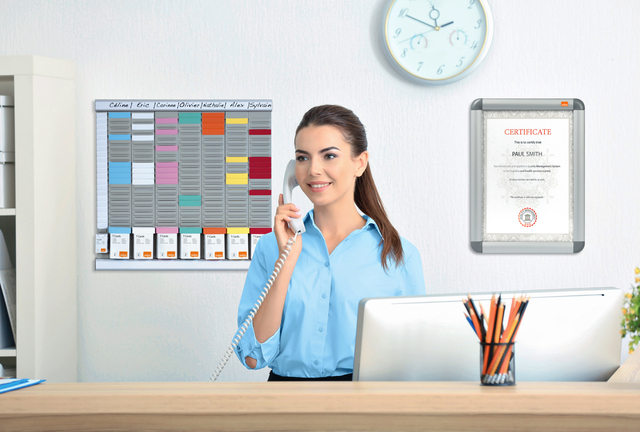 * Metalen uitvoering. * Ideaal voor garages, architecten, makelaars, rijscholen, hotels, verhuurbedrijven, artsen en iedereen die in één blik de activiteiten wil overzien. * Complete planningsset: panelen, geleiders, maand- en tijdsstroken. * 7 panelen met 24 sleuven voor T-kaarten in maat 2. * Met een indexpaneel met eveneens 24 sleuven voor kleinere datum-/tijdkaarten in maat 1. * 2 aluminium rail. * 4 paar gekleurde titelstroken. * 7 dozen met 100 T-kaarten in maat 2 in diverse kleuren, en 1 doos met 100 T-kaarten in maat 1. *Formaat 48 x 48 cm. * Kleur: zilver. * Gewicht: 1,97kg. 1 stuk