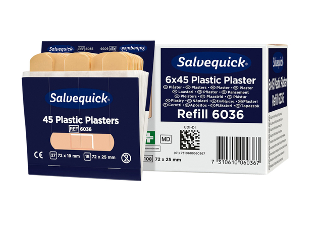 * Salvequick navulling plastic (6036) met 6 kaarten à 45 pleisters voor een Salvequick dispenser. * De pleisters zijn waterbestendig en per stuk verpakt. * 27stuks 72mmx19mm * 18stuks 72mmx25mm * Doos à 6 navullingen.