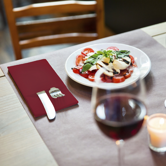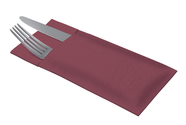 * De Tork LinStyle® Pochette bordeaux is ideaal voor fullservice restaurants waar kwaliteit en snelheid belangrijk zijn. * Omdat de servetten reeds zijn voorgevouwen tot pochette besparen ze het personeel veel tijd bij het dekken van de tafels.* De pochette staat ook garant voor een betere hygiëne omdat het bestek beschermd is. * Met deze pochette heb je een premium gevoel van linnen, zonder de waskosten, maar met een hoge absorptievermogen om morsingen te verwijderen. * Afmeting 90 x 195 x 195mm.