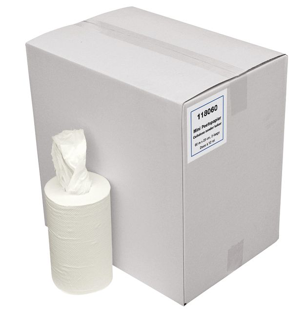 * Mini rol 2-laags cellulose papier, cordless. * De Mini rollen zijn van goede kwaliteit, hierdoor geschikt voor diverse toepassingen. * Extra hoog grams gewicht. * Hoog absorptievermogen en absorptiesnelheid. * Zeer zacht en pluisarm. * Geperforeerd per 38cm. * 2-laags embossed papier. * Rollengte 60m. * Rolbreedte 20cm. * Roldiameter 12,5cm. * Pak van 12 rollen.