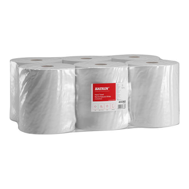 * Katrin Basic M handdoekrol. * Sterk absorberend papier, voor vele doeleinden geschikt. * 1-laags papier. * Afmetingen 18cm breed en 300 meter lang. * Ø 195mm. * Pak à 6 rol. * Voorzien van EU milieukeur én Nordic Swan. * Deze rol is voor centerfeed dispensers. * In het midden zit een kern die er uit getrokken moet worden vóór gebruik.