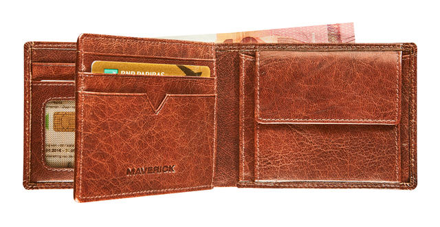 * MAVERICK ROUGH GEAR lederen billfold anti-skim met kleingeldvak. * ROUGH GEAR is een plantaardig gelooid, volnerf buffelleder. * Sterk en robuust. * Met een stoere nerf en duotoon kleureffect. * Een unieke look, dankzij de handgestikte naad in contrastkleur. * Lederen herenportefeuille met alle ruimte die je nodig hebt. * Plaats voor 8 creditcards, 2 biljetvakken, 1 ID-kaartvak en een kleingeldvak. * Al je spullen netjes opgeborgen, maar altijd binnen handbereik. * De RFID-bescherming werkt als een firewall en blokkeert de elektro-magnetische energie. * Zo zijn je met RFID-chips uitgeruste kaarten beveiligd tegen het illegaal uitlezen of kopiëren door onbekenden. * Denk aan OV-chipkaarten, creditcards, ID-kaarten en paspoorten. * 11 x 8,3 cm. * www.maverickleather.com