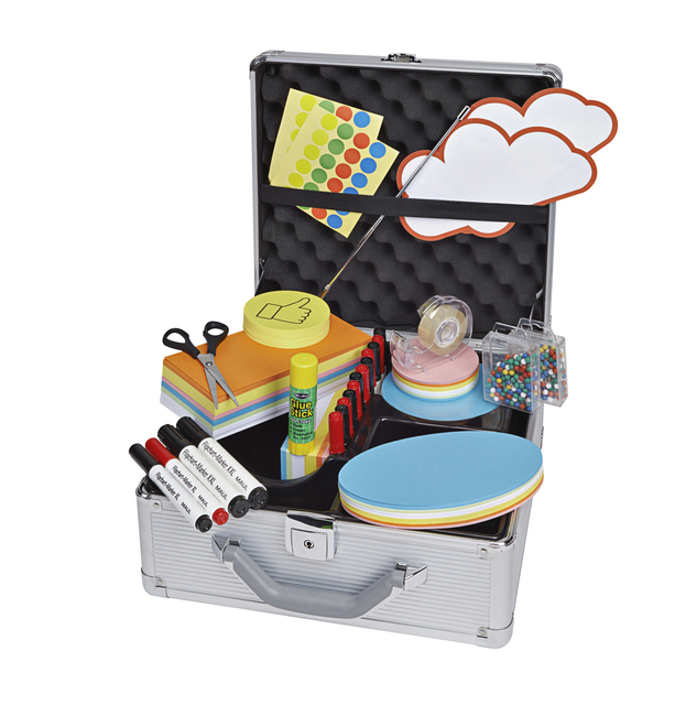 * Grote, hoogwaardige aluminium koffer. * Bestaand uit meer dan 2362 delen. * Representatief: Aluminium koffer met zilveren gegroefde optiek. * Voorgevormd interieur zorgt voor orde. * Afsluitbaar: Stabiel klapslot inclusief 2 sleutels. * Presentatiekaarten in top-kwaliteit, 150g/m², beide zijden te gebruiken. * Voor perfecte presentatie en workshops. * Ergonomische gevormde handgreep, solide hoekbescherming. * Schuimstof noppen in de deksel met band om grotere delen vast te maken. * Belastbare scharnieren, deksel met afknikbescherming. * 16 Flipchartmarkers XL, ronde punt, 2,0-2,5mm, 8 zwart, 8 rood. * 2 Flipchartmarkers XXL beitelpunt 3-6mm: rood, zwart. * 1 schaar met kunststof handgreep, 16cm, edelstaal. * 400 Signaal push-pins, gesorteerde kleuren. * 1 Plakbandafroller met plakband. * 1 lijmstift. * 6 Kleuren: Presentatiekaarten in de kleuren wit, geel, oranje, rood, groen en blauw. * 500 Presentatiekaarten 20,5x9,5cm, gesorteerde kleuren. * Presentatiekaarten Ø9,5cm, Ø13,5, ovaal 11x19cm, in gesorteerde kleuren, 120 stuks per formaat. * 20 Presentatie-wolken, 26,5x43cm. * 100 presentatiekaarten duim, om positief of negatief te beoordelen. * 960 Zelfklevende punten,gesorteerde kleuren. * Telescopische aanwijsstok met pen.