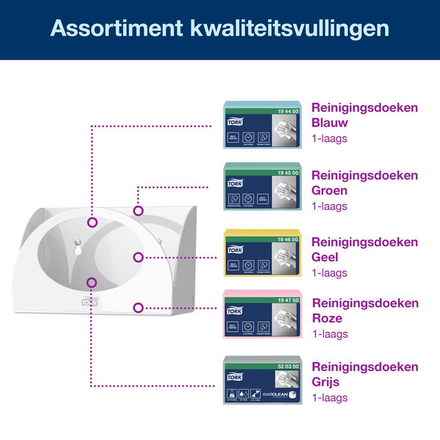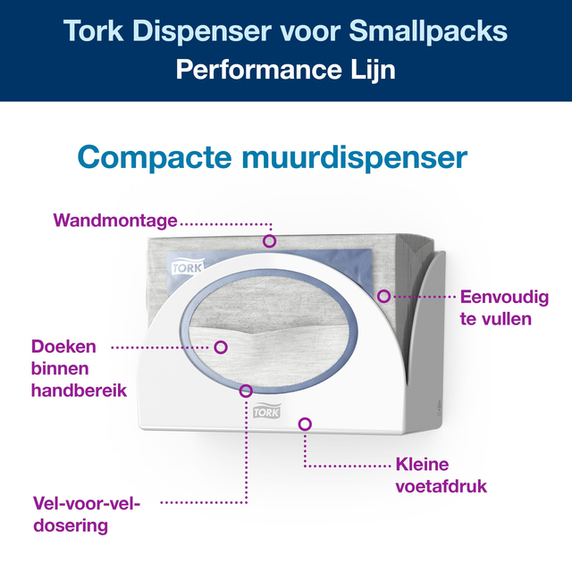 * De nieuwe Tork Small pack dispenser zijn eenvoudig te plaatsen op werkplekken waar maar weinig ruimte is. *Met deze dispenser heb je altijd reinigingsdoeken binnen handbereik.* Tevens biedt deze dispenser hygiënische bescherming en vel-voor-vel dosering om verbruik en afval te verminderen. * Afmeting 148 x 216 x 148mm.