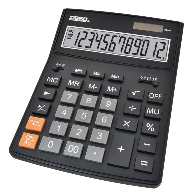 * Heavy Duty rekenmachine met dubbel geheugen, Mark-up functie en 12-cijferig display. * Extra groot formaat. * Werkt op zonne-energie en batterij. * Energiebesparende auto-off modus. * Rubberen voetjes. * Groot en schuin gepositioneerd duidelijk leesbaar LCD scherm. * LCD scherm voorzien van acryl glas. * Dubbel geheugen. * Grote makkelijk te bedienen toetsen. * Lay-out met voor de hand liggende kleur segmenten (functies/cijfers/on-ac) voor gemakkelijke input. * Afrondings- en decimaal-kiezer. * Zakelijke functies: MU - Backspace - 00. * Afmetingen 205x155x40mm.