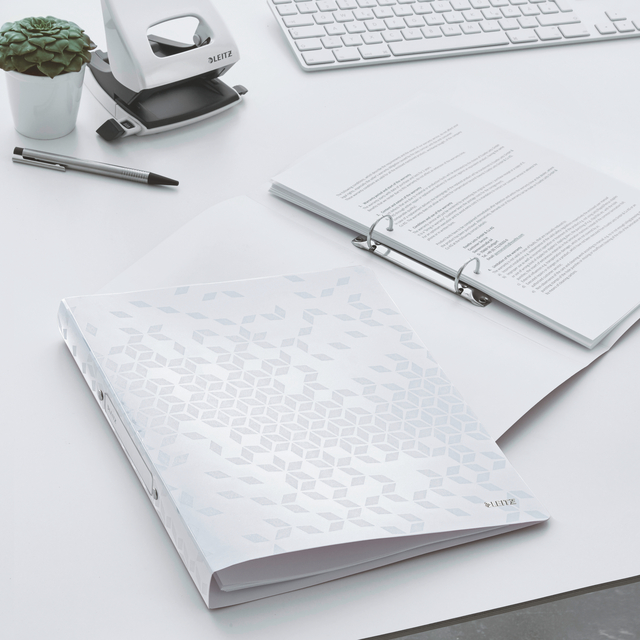 * Stijl en kwaliteit komen samen in deze witte PP-ringband. Het opvallende geometrische patroon zorgt voor een echte WOW factor. Perfect voor studenten, professionals en iedereen die houdt van een trendy en decoratieve opbergmap. * Dankzij het label op de rug haal je eenvoudig de juiste map uit de kast. * Ideaal voor papieren, showtassen of tabbladen in A4-formaat. * De capaciteit bedraagt 190 A4 vel (80 g/m²). * FSC® gecertificeerd.