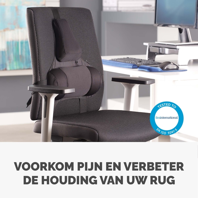 * Professional Ultieme rugsteun. * Innovatieve Tri-Tachment zorgt voor stabiliteit en hoeft niet steeds opnieuw te worden ingesteld. * Ingebouwde Microbanbescherming vermindert de groei van schadelijke bacteriën voor een langere levensduur van het product. * Steun voor de onderrug op drie plaatsen, die uitzet en inkrimpt en zich zo aanpast aan de natuurlijke lichaamsrondingen. * De steun voor het bovenste gedeelte van de rug bestaat uit schuim met lage dichtheid dat de lichaamshouding op een subtiele manier ondersteunt. * Het ontwerp is volledig verstelbaar, hierdoor past het op de meeste bureaustoelen. * Gemakkelijk te plaatsen: bevestig de steun aan de stoel met de banden.
