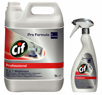 * Cif Professional 2in1 reinigingsmiddelen.* Sanitairreiniger verwijdert kalkaanslag, vuil- en zeepresten en biedt een schitterend resultaat met een langdurig fris parfum.* Sanitairontkalker. is een gebruiksklare periodieke ontkalker met aangename geur voor effectieve verwijdering van urine- en kalkaanslag op sanitaire oppervlakken.* De Glas en interieurreiniger laat in enkele ogenblikken een glanzend en streeploos oppervlak na. * Gevarenaanduiding; * H319 "veroorzaakt ernstige oogirritatie". * Veiligheidsinformatie: zorg voor een goed niveau van algemene ventilatie. * Vermijdt, waar mogelijk, direct contact en/of spatten. * Bij normaal gebruik is een veiligheidsbril niet nodig. Echter, het gebruik wordt aanbevolen in die gevallen waarbij spatgevaar bestaat bij hantering van het product (EN 166). * Was en droog de handen na gebruik. * Bij langdurig contact kan huidbescherming nodig zijn. *Bij normaal gebruik is ademhalingsbescherming niet nodig. Echter inademing van damp, spray, gas of aerosol moet worden voorkomen. * Veiligheidsinformatie. * P102 "Buiten het bereik van kinderen houden". * P101 "Bij het inwinnen van medisch advies, de verpakking of het etiket ter beschikking houden". * Raadpleeg een arts of anti-gif centrum bij onwel voelen of irritatie na inademing, aanraking met huid en/of ogen of inslikken. * Bij aanraking met de huid dient de huid gewassen te worden met lauw, zacht stromend water gedurende minstens 30 minuten. * Bij aanraking met de ogen dienen ogen gespoeld te worden met lauw water, gedurende minsten 15 minuten. * Contactlenzen dienen, indien mogelijk verwijderd te worden. * Bij inslikken de mond spoelen, onmiddellijk 1 glas water drinken en geen braken opwekken. * Bij een bewusteloos persoon nooit iets via de mond toedienen. 1 fles