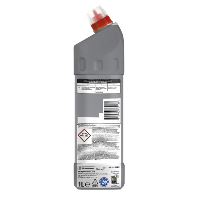 * Glorix Pro Formula Toilet Gel is een effectieve, bleekvrije toiletreiniger die reinigt en tegelijkertijd 100% van de kalkaanslag verwijdert. Door de gelconsistentie hecht het zich aan de wanden van de toiletpot en werkt het zelfs onder de waterlijn. Het toilet wordt schoon, kalkvrij en heeft een verfrissende oceaangeur. * 3x dikker dan andere kalkverwijderaars * Reinigt en verwijdert kalkaanslag * Gelconsistentie voor maximaal effect; blijft langer aan het oppervlak kleven * Werkt onder de waterlijn * Bleekvrije toiletreiniger zonder nare bleekgeur * Verwijdert geurtjes, laat een frisse oceaangeur achter * Gebruiksvriendelijke fles in een groter, professioneel 1 liter formaat. * Veiligheidsinformatie. * Irriterend voor de ogen en de huid. * Buiten bereik van kinderen bewaren. * Gevarenaanduiding; * H290 "Kan bijtend zijn voor metalen". * H314 "Veroorzaakt ernstige brandworden en oogletsel. * H319 Veroorzaakt ernstige oogirritatie. * H412 Schadelijk voor in het water levende organismen, met langdurige gevolgen. * Veiligheidsvoorschriften; * P101 Bij het inwinnen van medisch advies, de verpakking of het etiket ter beschikking houden. * P102 "Buiten het bereik van kinderen houden". * P280 Beschermende handschoenen, beschermende kleding en oog- of gelaatsbescherming dragen. * P301 + P330 + P331 NA INSLIKKEN: de mond spoelen. GEEN braken opwekken. * P303 + P361 + P353 BIJ CONTACT MET DE HUID (of het haar): verontreinigde kleding onmiddellijk uittrekken. Huid met water afspoelen of afdouchen. * P305 + P351 + P338 BIJ CONTACT MET DE OGEN: voorzichtig afspoelen met water gedurende een aantal minuten; contactlenzen verwijderen, indien mogelijk; blijven spoelen. * P310 Onmiddellijk een ANTIGIFCENTRUM (B) of een arts (NL) raadplegen.. * P405 Achter slot bewaren. * P501 - Niet gebruikte inhoud als chemisch afval afvoeren.