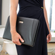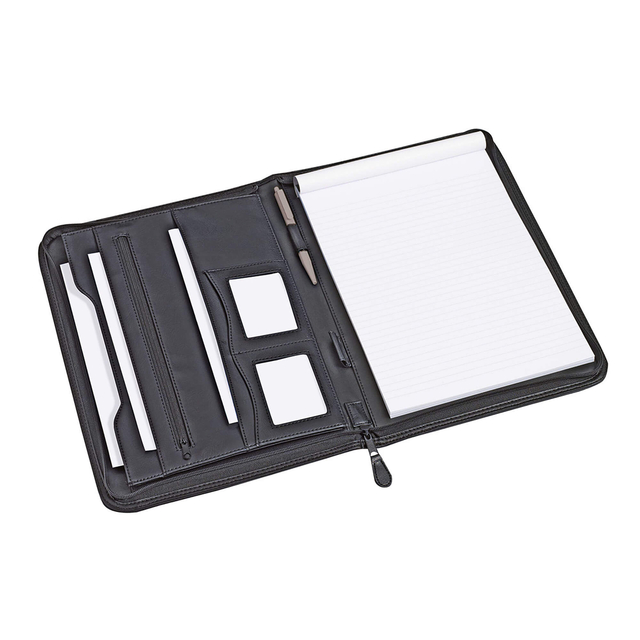 * Schrijfmap Excellent de luxe is gemaakt van lederlook materiaal. * Aan de linker binnenzijde zitten diverse insteekvakken voor visitekaartjes en documenten. * Een insteekvak is afsluitbaar met een rits. * In het midden balpenhouders. * Op de rechter binnenzijde vindt u een gelinieerd schrijfblok. * De map is afsluitbaar met een rits. * Metalen plaatje aan de buitenzijde waarop een tekst/logo middels lasergravure aangebracht kan worden. * Kleur zwart. 1 stuk