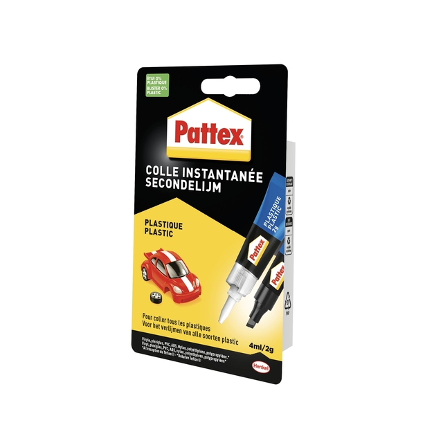 * Pattex Secondelijm Plastics – voor supersnelle en supersterke verlijmingen van alle kunststoffen (1). Pattex Secondelijm Plastics is ideaal voor doe-het-zelvers die op zoek zijn naar een lijm die snelle, schone en effectieve verlijmingen mogelijk maakt. Deze transparante secondelijm van Pattex hecht dankzij de extra sterke formule bijzonder goed op alle kunststof oppervlakken. Naast polyethyleen (PE) en polypropyleen (PP) is de superlijm onder andere geschikt voor PVC, ABS, acrylglas en voor het verlijmen van plexiglas. De lijm hecht ook op veel andere materialen* en is onder andere geschikt als porseleinlijm, keramieklijm, houtlijm, metaallijm en steenlijm. Dit maakt de lijm ideaal voor het herstellen en verlijmen van kunststofvoorwerpen zoals speelgoed, spelletjes, autoaccessoires, kantoorbenodigdheden en computeronderdelen. De krachtige lijm droogt onmiddellijk en transparant op.