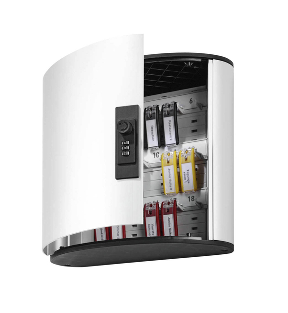 * Sleutelkast met cijferslot. * Voor 18 KEY CLIP sleutelhangers. * Gemaakt van aluminium. * Uniek opbergsysteem voor sleutels dankzij de sleutelhanger KEY CLIP, waarvan de insert steeds leesbaar is. * De inserts kunnen gemakkelijk worden bedrukt via een gratis software die u vindt onder "Donwloads - inserts" op deze website. * Inclusief 6 sleutelhangers KEY CLIP. * Extra sleutelhangers kunnen apart worden besteld (ref. 1957). * Instelbare code met 1000 mogelijke combinaties. * Afmetingen: 302x280x118mm (bxhxd).